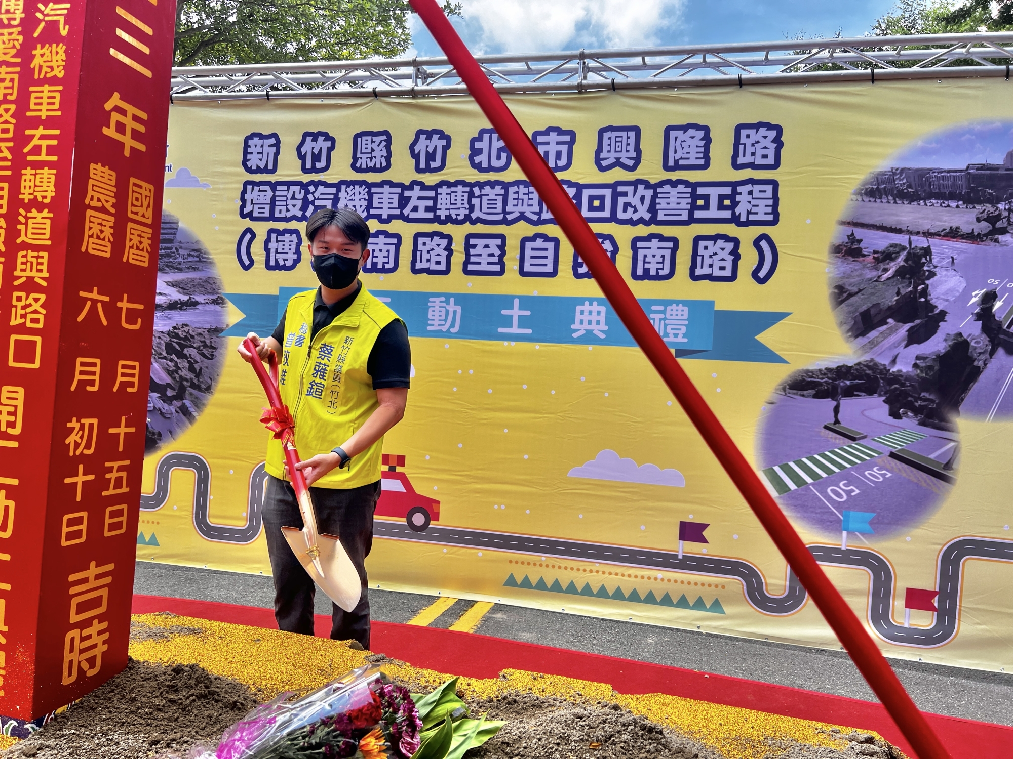 內政部國土管理署補助新竹縣政府辦理「校園周邊暨行車安全道路改善計畫-新竹縣竹北市興隆路增設汽機車左轉道與路口改善工程(博愛南路至自強南路)」,今(15)日上午舉行開工動土典禮,由新竹縣長楊文科、內政部國土管理署北區都市基礎工程分署署長曾正宗,與新竹縣多名議員等出席,期望透過此工程改善9處路口,提升道路使用的便利性,及行人、及汽機車駕駛的整體安全。