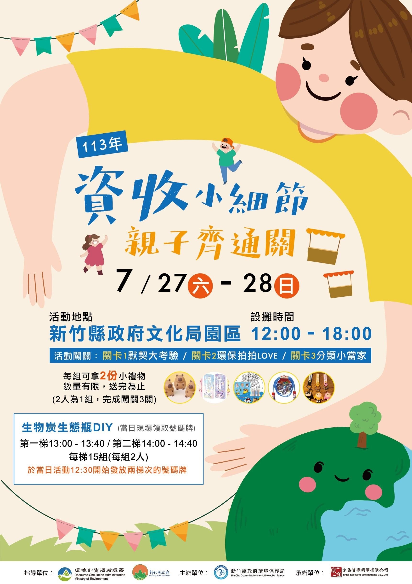 竹縣府環保局「資收小細節 親子齊通關」將於27日、28日熱鬧登場!為加強縣民資源回收知識與觀念,今年度特別結合縣府文化局親子小戲節活動於縣府文化局園區辦理親子闖關拿獎品活動,現場還可以報名體驗生態瓶DIY,歡迎大家踴躍參與,攜手加入回收知識列車行列,帶回滿滿的回收知識吧!
