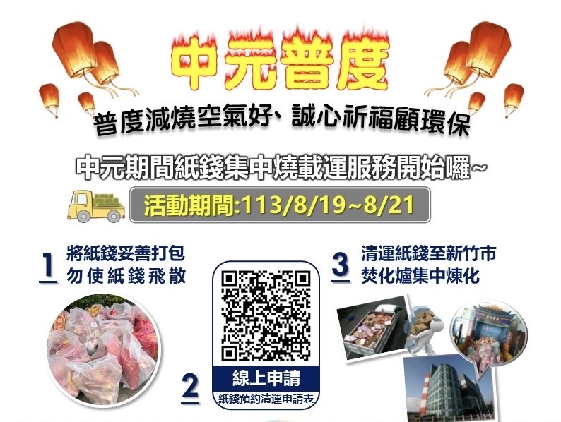 竹縣府環保局說,「乾淨燒」是將紙錢集中收運至設有空污防制設施的焚化爐,或環保金爐來焚燒。縣內社區大樓、公司行號、機關團體及宗教場所等,可透過環保局寄發之活動回函以傳真、線上預約或撥打專線等方式,向環保局預約申請到府清運(清運時間:國曆8月19日至8月21日)。
