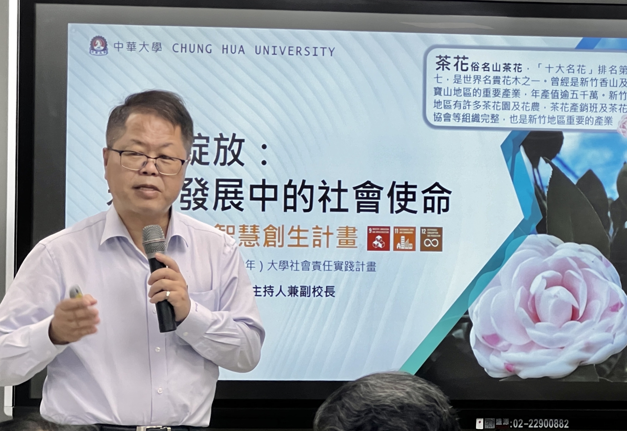 計畫主持人中華大學副校長解鴻年,以推展馥活茶花智慧創生計畫,即席分享計劃推展原則和方向說,茶花俗名山茶花,「十大名花」排名第七,是世界名貴花木之一。曾經是新竹香山及寶山地區的重要產業,年產值逾五千萬。新竹