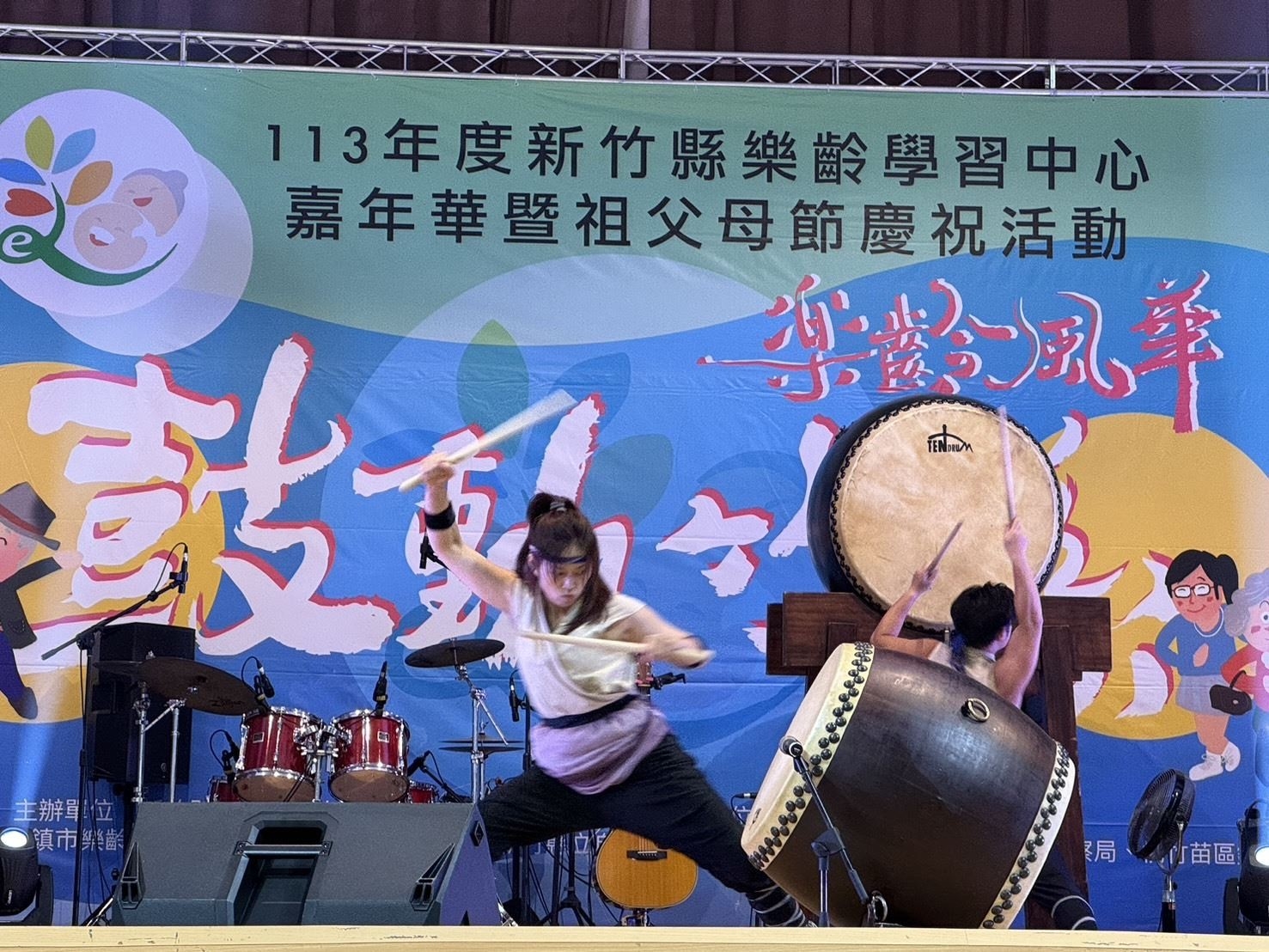 竹縣樂齡學習中心將慶祝重心,以長期深耕的太鼓課程為主題,特別邀請國際知名十鼓擊樂團、打幫你樂團與13鄉鎮市的樂齡中心,長輩們聯手帶來精采的打擊展演秀,樂齡族用擊鼓闊歌,讓現場觀眾留下「客鼓銘心」的回憶。