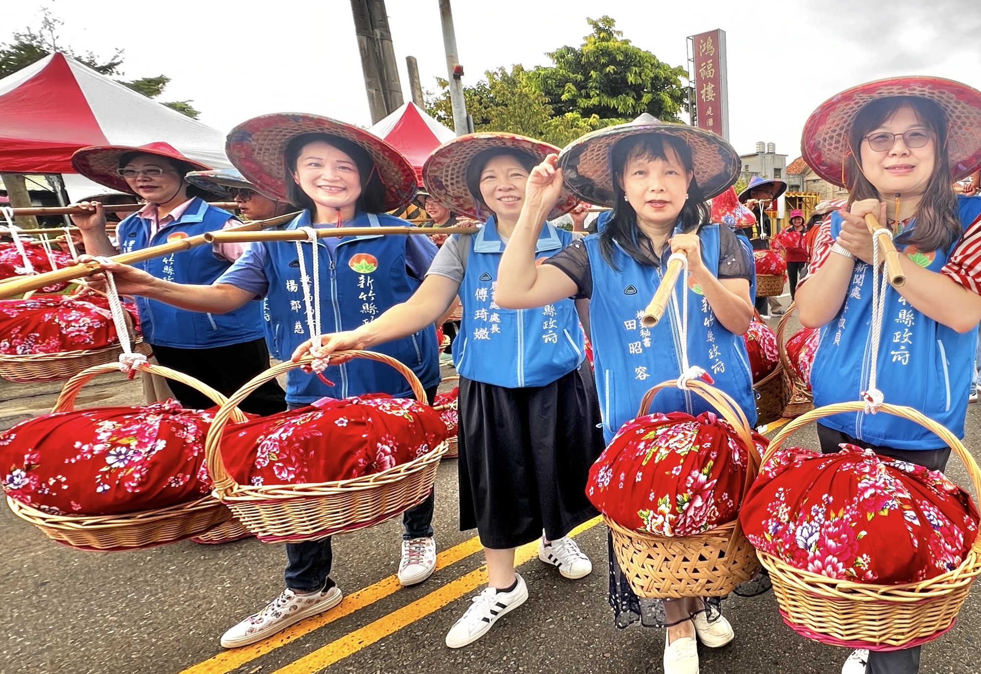 義魄千秋-2024全國義民祭,17日在新竹縣新埔褒忠義民廟熱鬧登場,《擔擔相傳.代代傳》創意挑擔進場,竹縣府要角局處五大金釵,恰巧聚合成排,表現網紅出色。