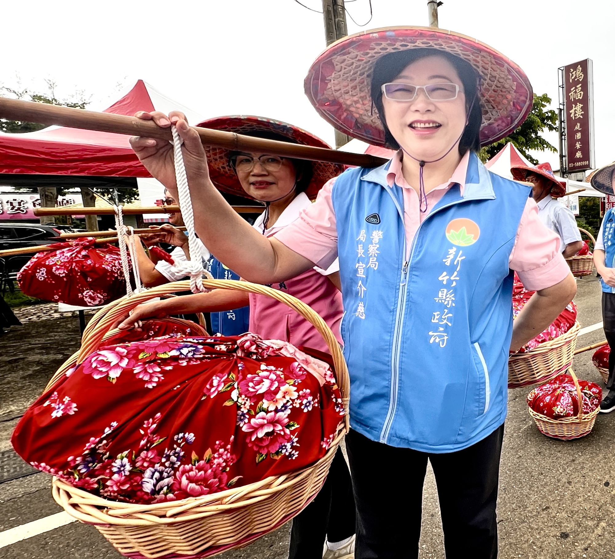 新聞處副處長蔡淑貞、機要秘書田昭容、農業處處長傅琦媺、教育局長楊郡慈、警察局長宣介慈五位金釵,艷陽正頭戴斗笠,一字排開挑著客家紅花布擔子,進廟祈福,神情表現各有千秋,大致有一股上山會砍柴,下田會插秧,傳統客家婦女勤勞刻苦的精神。