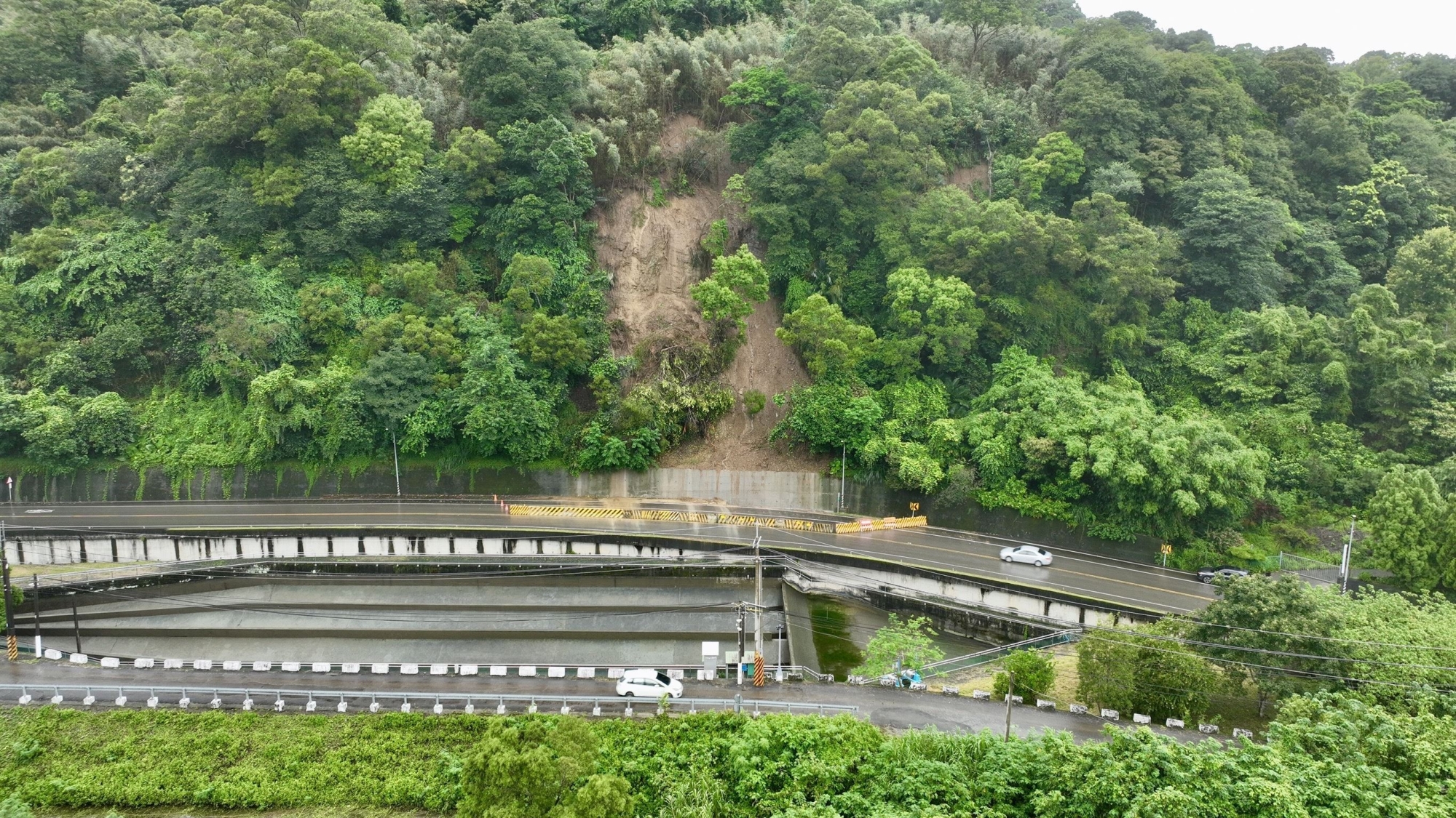 目前邊坡仍處於不穩定狀態,苗栗工務處加班持續派機具,清除土石,擺放紐澤西護欄實施交維。進出當地小心駕駛。