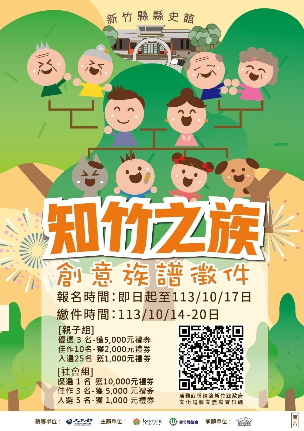 竹縣縣史館辦理「知竹之族—創意族譜徵件」活動,即日起至10月17日徵求竹縣創意家族族譜與新竹歷史人物族譜,鼓勵民眾追本溯源一同研究自己的家族脈絡或家鄉歷史人物,收集家族的有趣故事,並透過創意的手法,製作屬於自己家族的家族樹。
