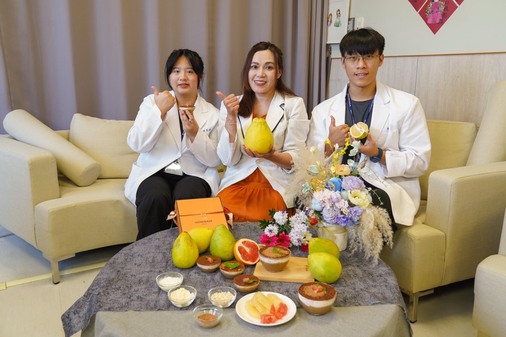 中秋節前夕,柚子盛產季節,中國醫藥大學新竹附設醫院鐘捷瀠營養師,帶領中國醫藥大學及中山醫學大學營養學系兩位學生一起發揮創意,將高熱量、高蛋白質的食材,癌症腫瘤配方營養品,蜂蜜優格,柚子,燕麥片、乳清蛋白粉,可可粉等,結合柚子,針對癌友製作「柚香提拉米蘇」,簡單營養好製作。