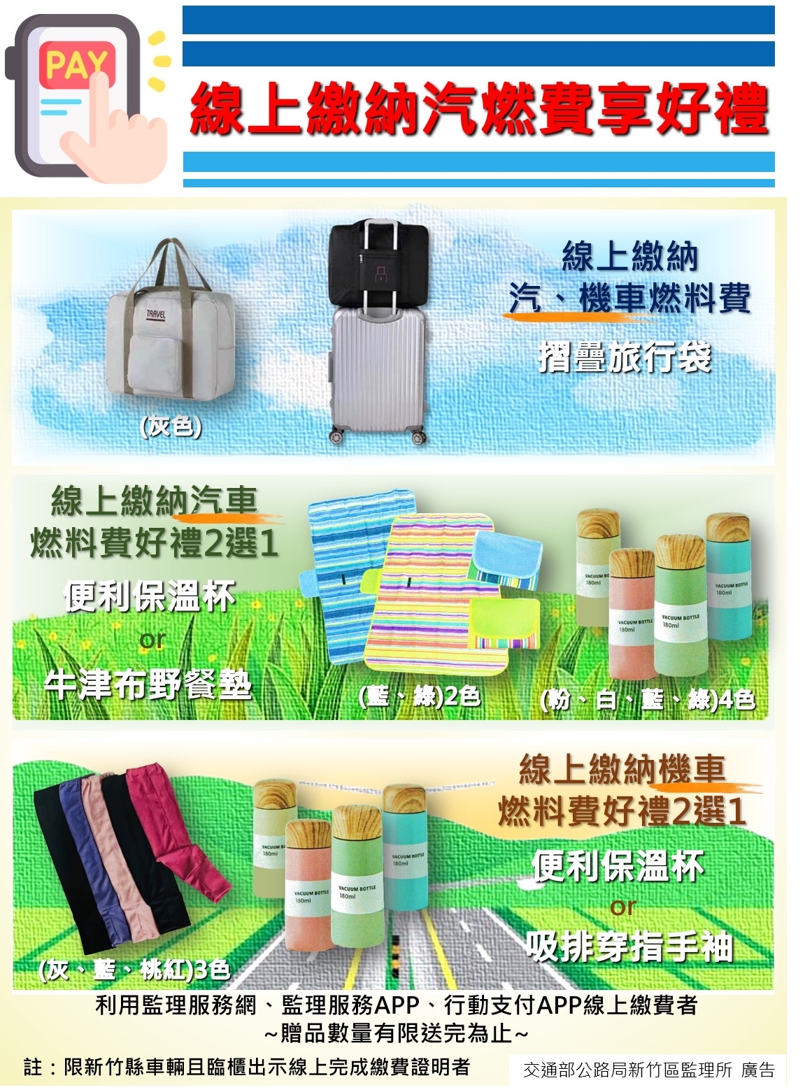 新竹所另建議民眾可多加利用線上繳費服務,省去臨櫃繳納的交通與麻煩,另外若車主車輛地址(車籍地)登記在新竹縣,尚可憑線上繳費完成之截圖畫面,至該所1樓汽燃費窗口兌換精美好禮(如附圖;恕不郵寄),敬請把握最後機會,數量有限送完為止。