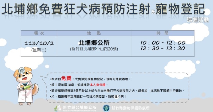 為防範狂犬病,新竹縣動物保護防疫所訂於10月2日(週三)在北埔鄉公所,辦理免費狂犬病預防注射及寵物登記巡迴活動,歡迎攜帶家犬、家貓施打疫苗,增加毛寶貝的保護力,也守護家人的健康。