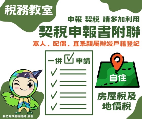 竹縣府稅務局表示,民眾買賣或受贈取得房屋,於申報契稅時,如新所有權人取得房屋後符合自住住家使用,請記得一併填寫「契稅申報書附聯」,即可完成房屋稅及地價稅優惠稅率之申請。