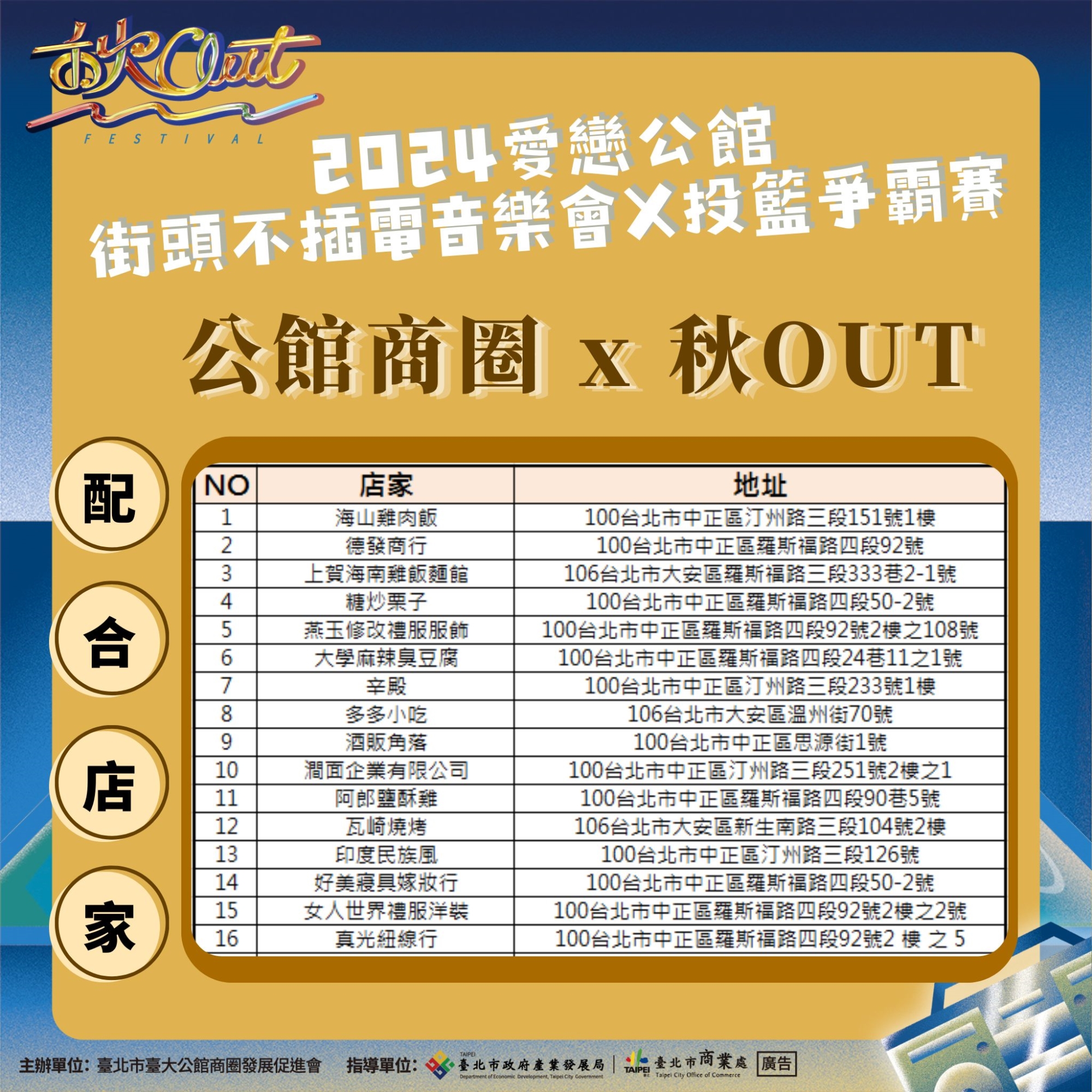 2024愛戀公館結合秋OUT音樂節與投籃機爭霸,即將於28日隆重登場的「2024愛戀公館-街頭不插電音樂會x投籃爭霸賽」,是一場結合熱血競技與悠閒音樂的盛大活動,由臺北市商業處輔導臺大公館商圈發展促進會精心籌劃。臺大公館商圈發展促進會周麗華表示,其中「投籃機爭霸賽」熱血報名中,不但免費,而且有報名就能獲得公館饗樂券。也可於活動當日帶著5張9月份發票或公館於配合店家消費滿500元之收據或發票到活動現場,並在指定貼文下留言,也可兌換饗樂券1張。