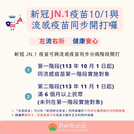 113年公費流感疫苗及新冠疫苗(單價JN.1)今(10月1日)起分階段同步開打,新竹縣內13鄉鎮市衛生所及31家合約醫療院所可同時提供接種流感疫苗及新冠疫苗,為鼓勵民眾在竹縣接種新冠JN.1疫苗,衛生局提供100元禮券獎勵,數量有限,送完為止。