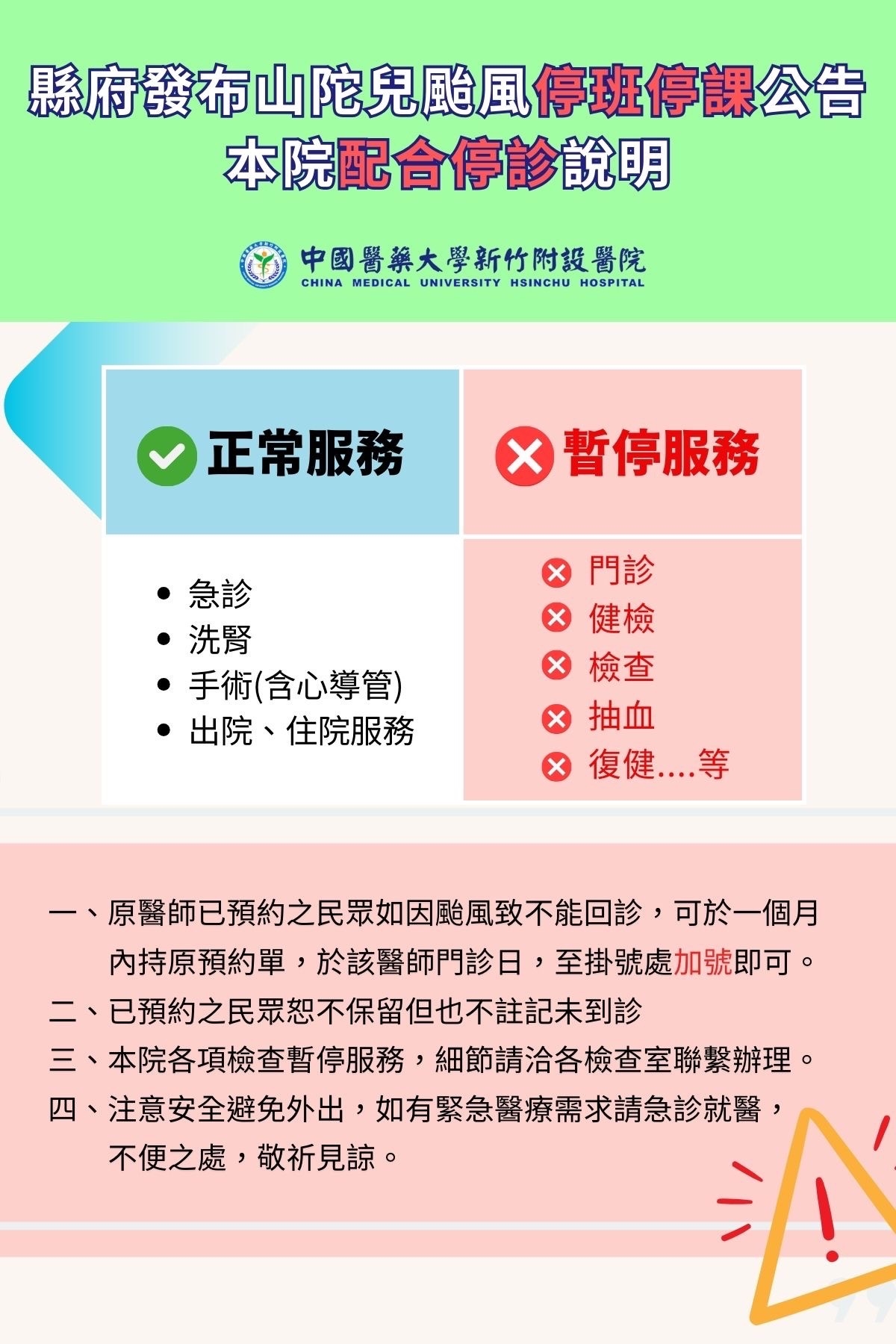 中國醫藥大學新竹醫院因應颱風,新竹縣政府發布颱風停班停課公告,明日(10/3)全面停診說明