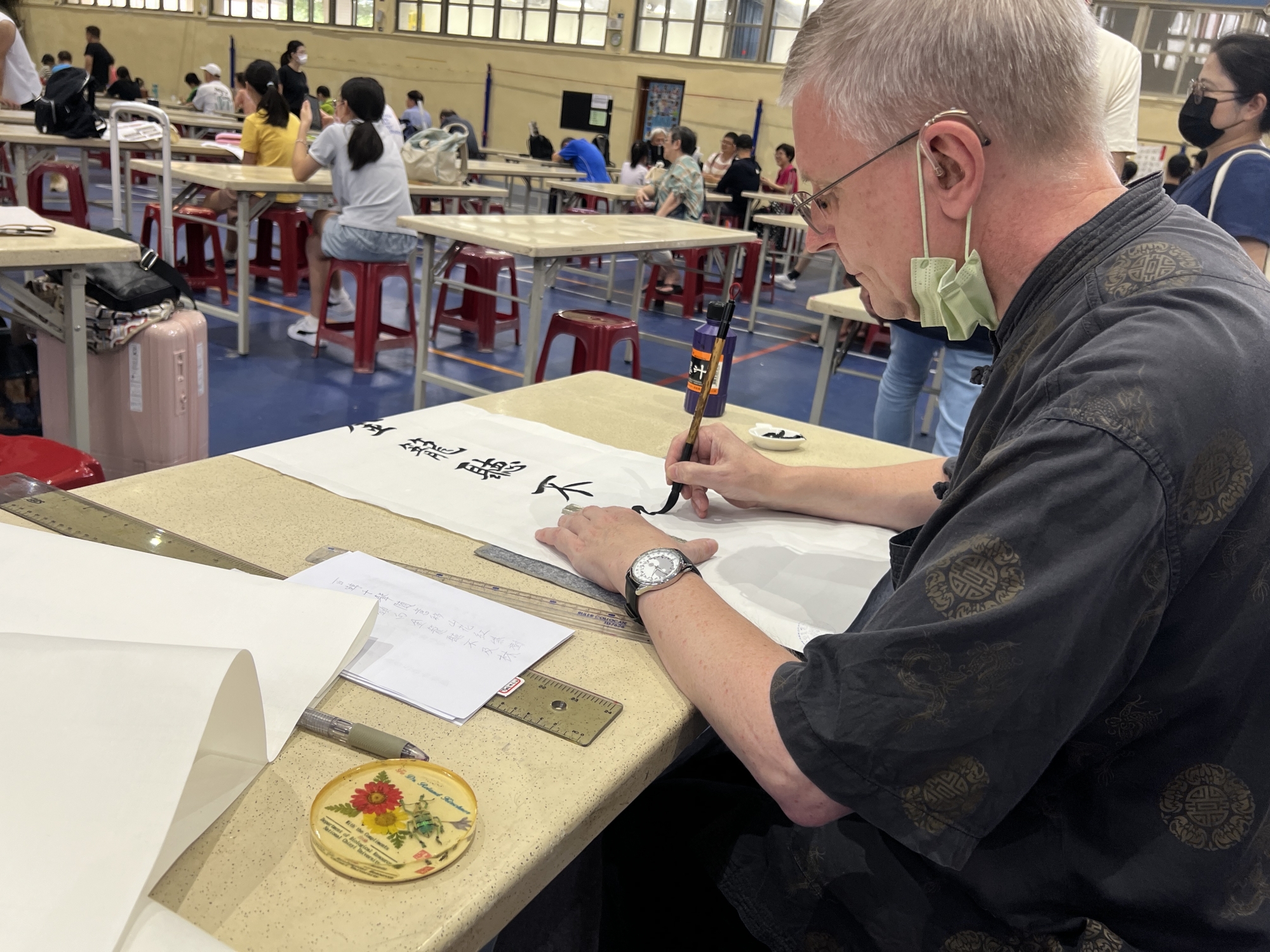 全國書法決賽設有國際組,來自德國、今年56歲的羅南德,有著一副西方臉孔,卻寫得一手好毛筆字,特別引人注目。羅南德說,過去他在德國與台灣交換學生練習基本的書法,直到20多年前因工作來台,目前在台灣大學教授生物專業,在台期間持續找老師學習書法,斷斷續續學習了13年,專長是楷書,但偶爾也會練習行書或篆書,而這次是第一次參加新竹的書法比賽。