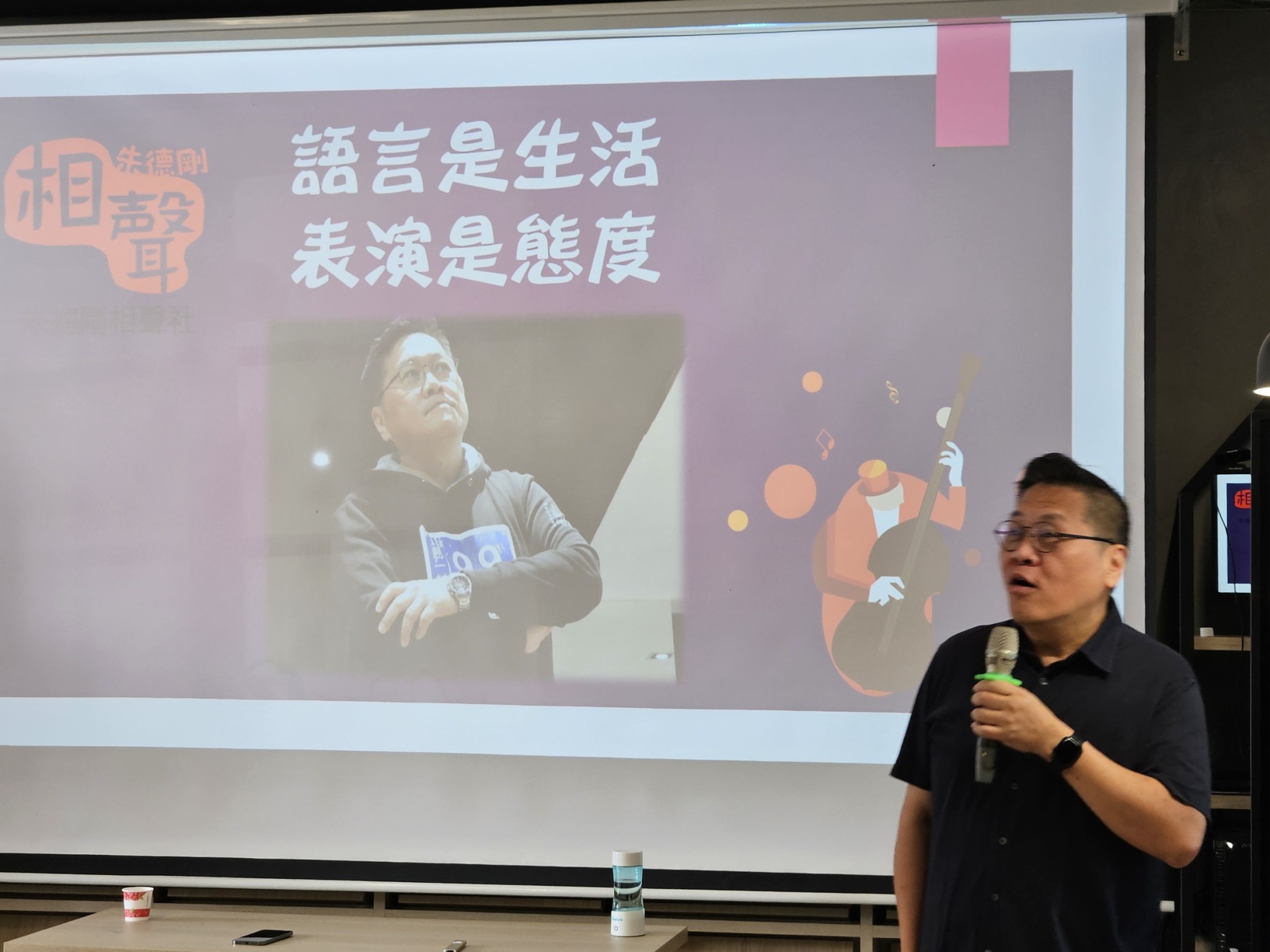 教育部樂齡學習中心中區輔導團邀請表演藝術家朱德剛分享相聲演員的生命經驗,他以「語言是生活,表演是態度」為題,歸納自身30餘年的表演經驗,與樂齡中心的講師們共同探討人生成長歷程;演講過程中,朱德剛不只面部表情豐富,「聲音表情」也抑揚頓挫,帶動全場笑聲連連、收穫滿滿。