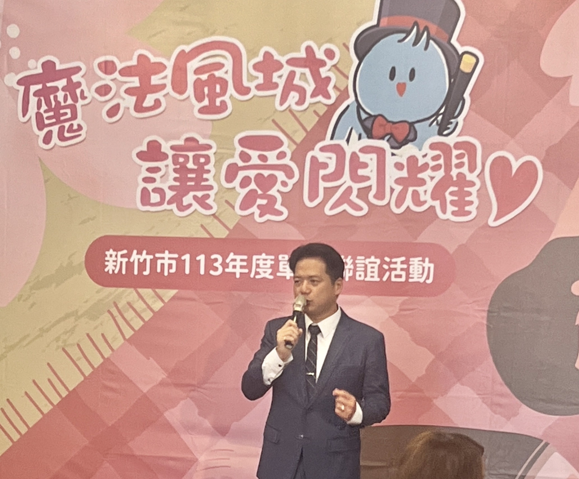 竹市府今(17)日舉辦「魔法風城、讓愛閃耀」單身聯誼活動宣傳記者會,代理市長邱臣遠化身愛情魔法師,親自變出1枚閃亮鑽戒,為此次聯誼活動揭開序幕。