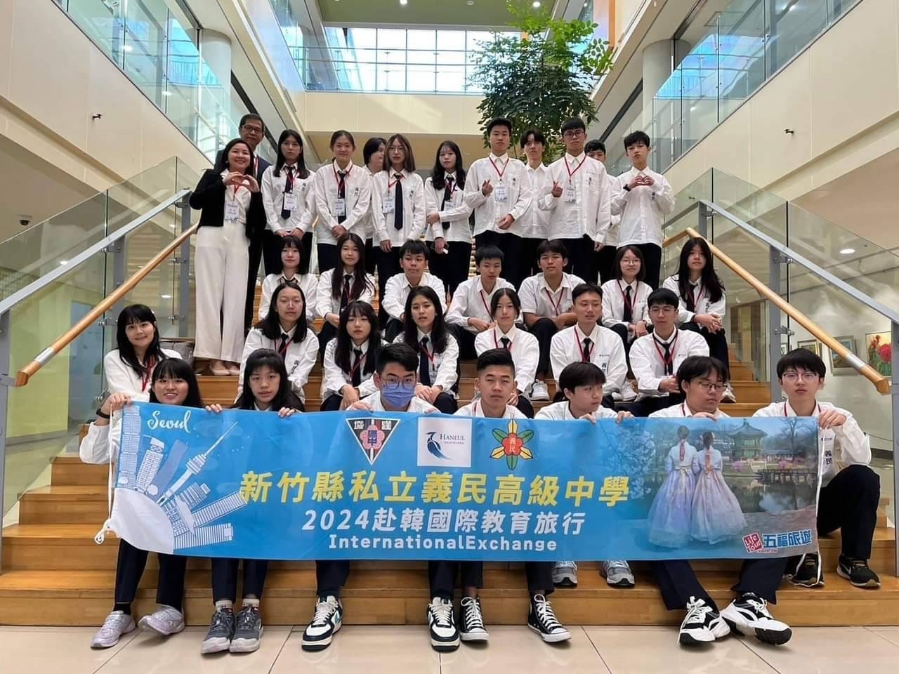 新竹縣義民高中以AI、雙語、永續為主軸,展開為期六天的赴韓國際教育旅行,義民高中師生與韓國仁川天空高中(HaneulAcademy)於10月16日訪問,並安排一場交流課程(30名學生+4名老師)。