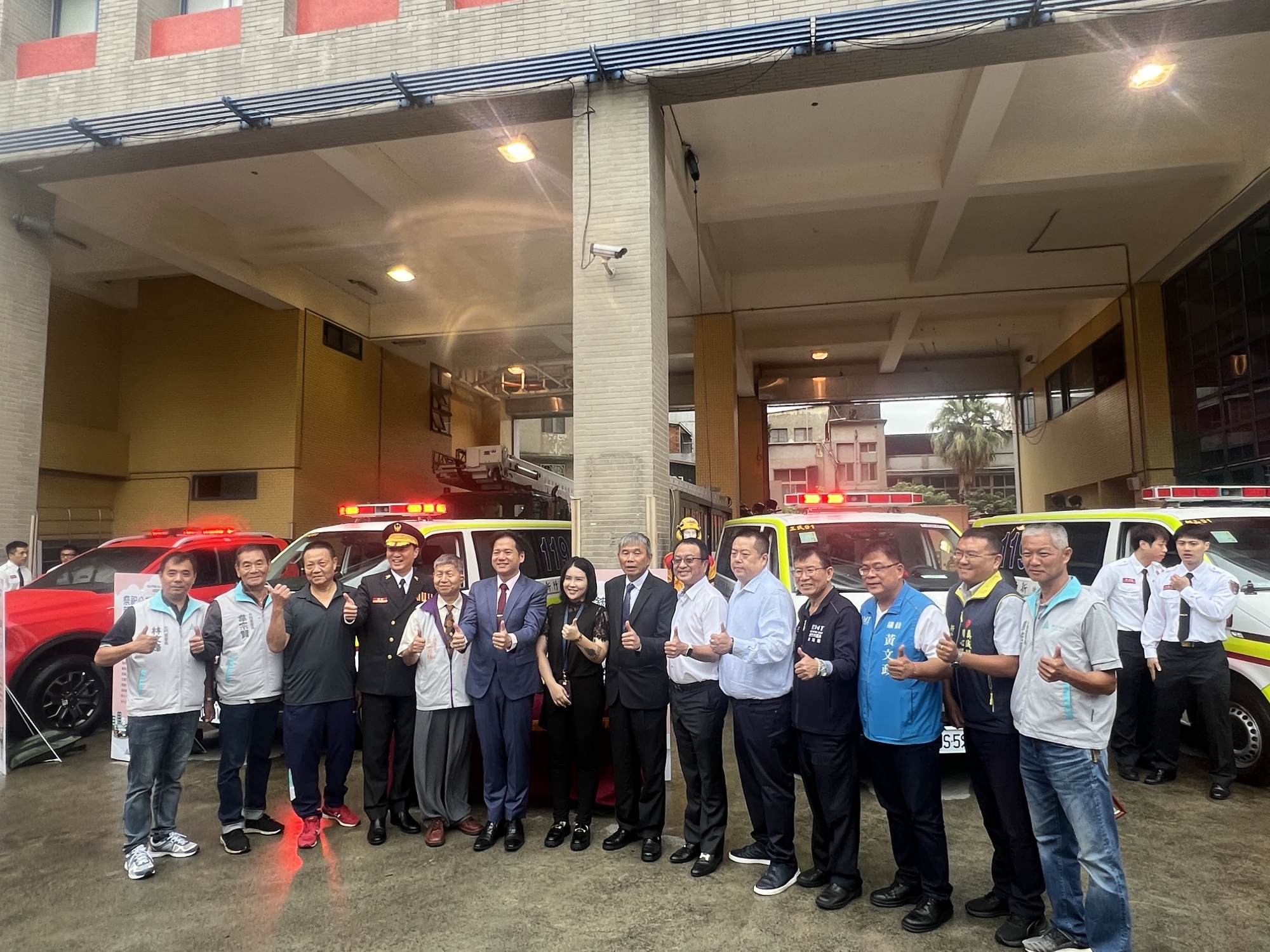 竹市今(24)日在消防局舉辦聯合捐贈儀式,共計有5組熱心公益的企業及人士,分別捐贈市府3輛全配備救護車、1輛消防警備車、特種搜救隊個人裝備、消防頭盔、消防團體工作服及裝備,總計捐贈金額1,598萬8千元,
