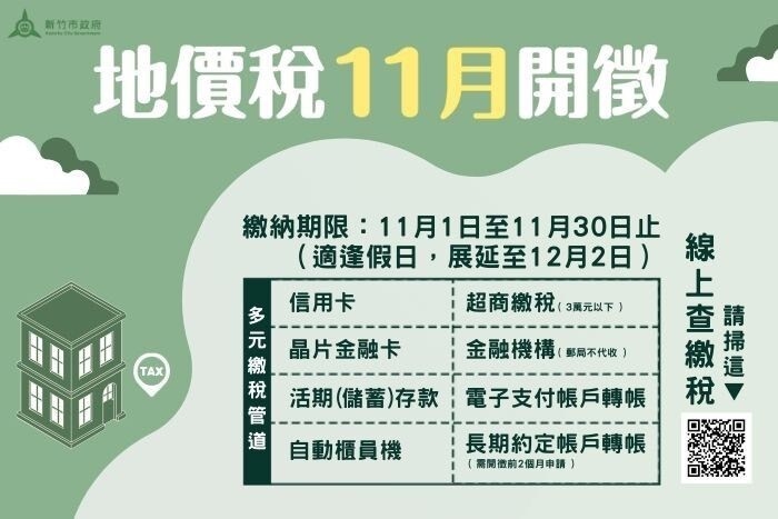 新竹市113年地價稅將於11月1日開徵,繳納期限至12月2日(原定11月30日,適逢假日展延),稅單及轉帳繳納通知已於23日全面寄發,新竹市稅務局為鼓勵民眾使用e化繳稅,凡以線上查繳稅、行動支付或掃描QR-Code等e化繳稅管道繳納今年地價稅,就有機會抽中萬元商品券。