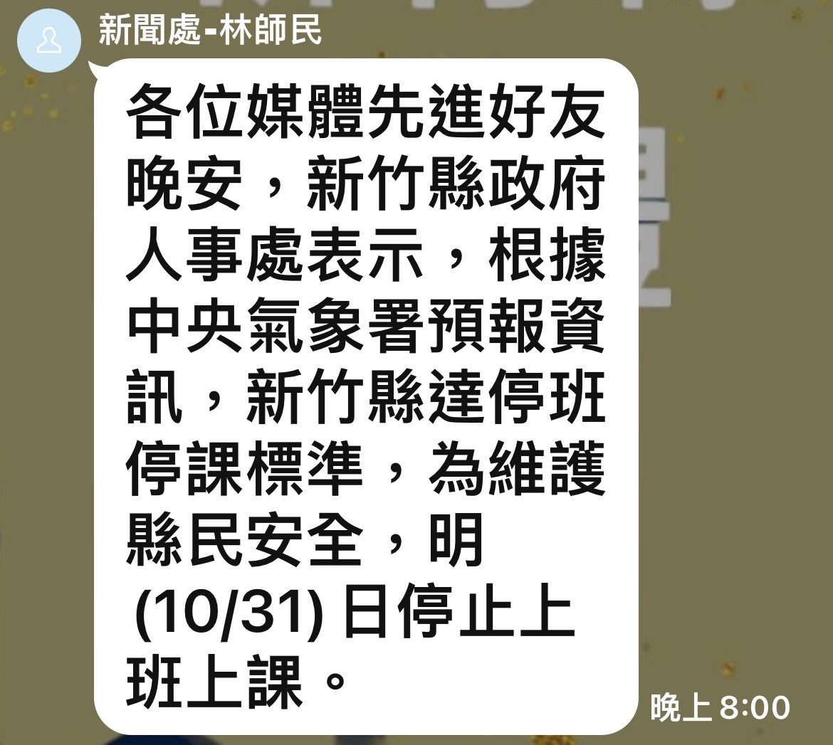 新竹市政府通知媒體說,各位媒體先進好,新竹市政府公告「新竹市10月31日(四)停止上班、停止上課」。