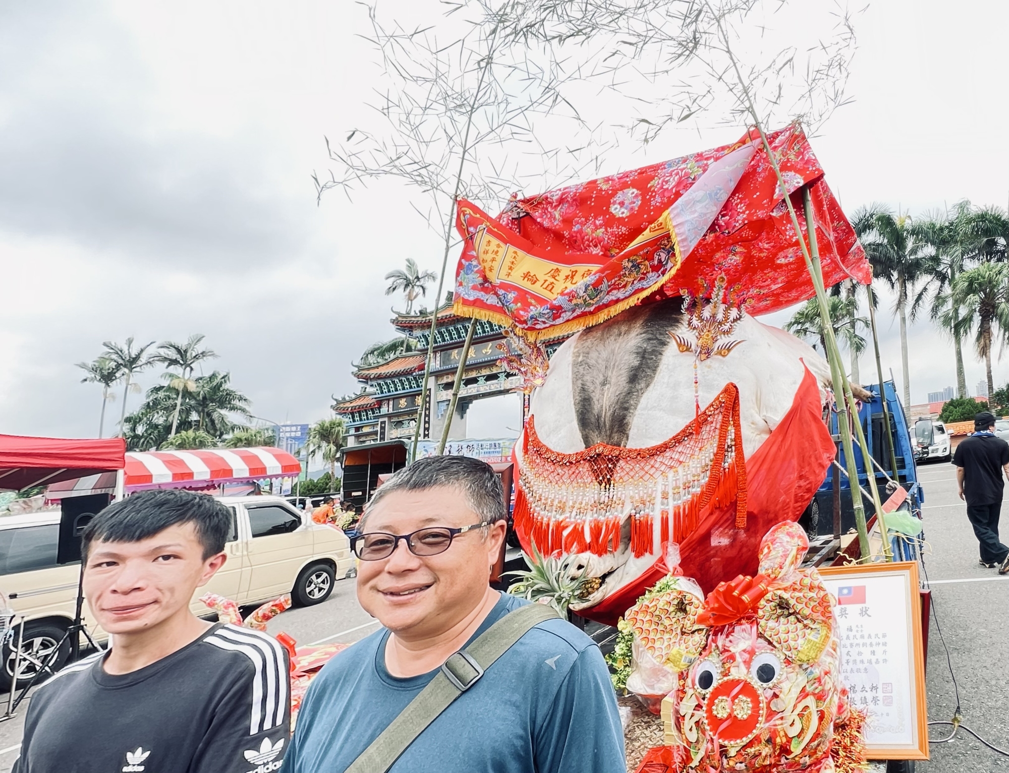 林政男渾身是汗指著在一旁拿著涼茶喝的年輕人林祐民說,我和侄子把這個喜事摃了下來,確實有些累,父親林金福已經86歲高齡,還是惦念義民祭的事情,他很想參與,但是力不從心,見到兒孫用心養豬,參加比賽得獎,老人家非常興奮說,這一輩子總算見到義民廟獎狀了。