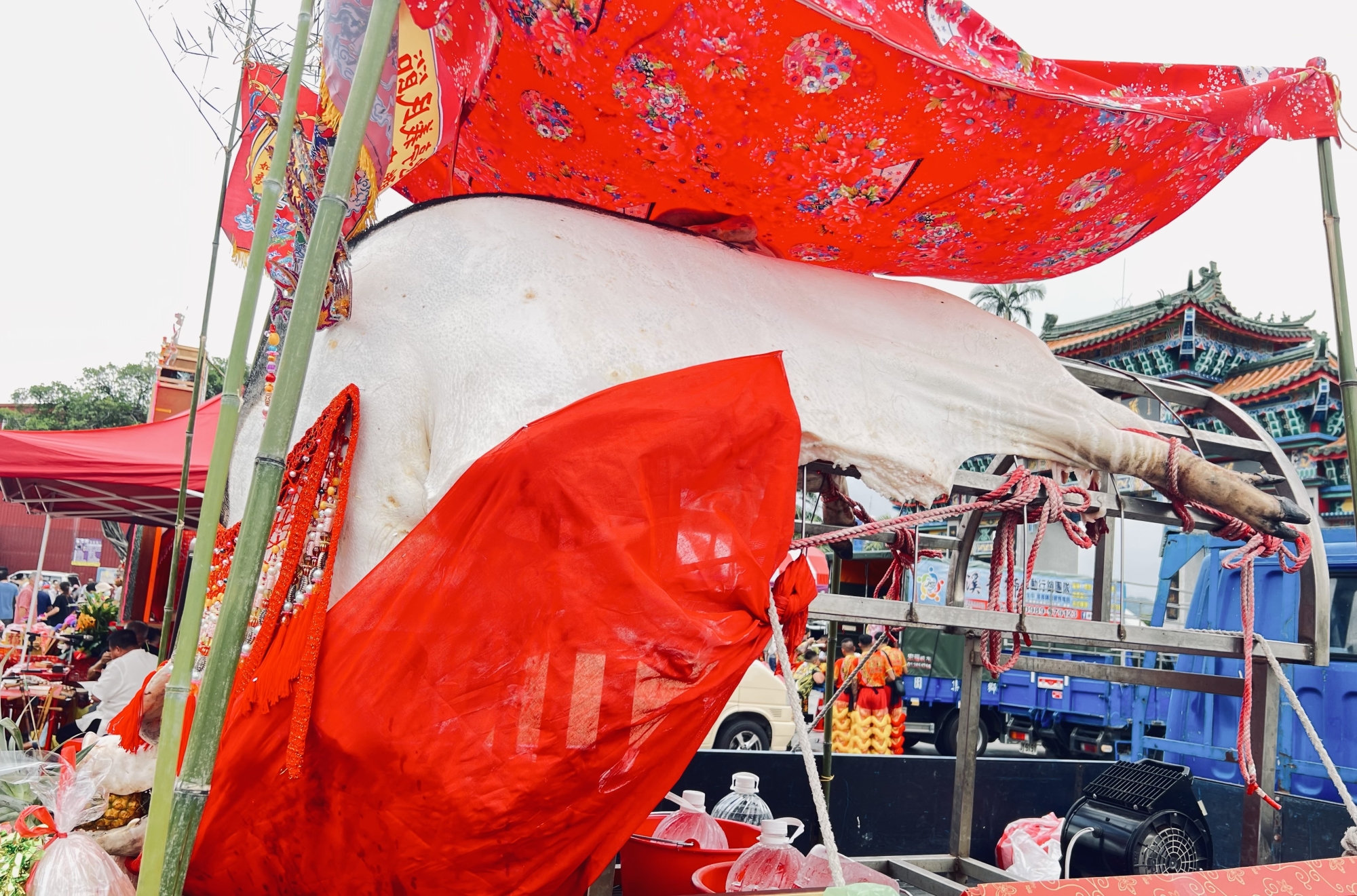 樸素簡單裝飾。自然的細黃竹子和紅布及客家花布陪襯,遊客一眼高能看見的神豬,沒有箱圍掩飾,神豬下面放著冰塊降溫,防範肉體變質,正如一幅鄉野純樸寫生畫,吸引了遊客不斷打探拍照。