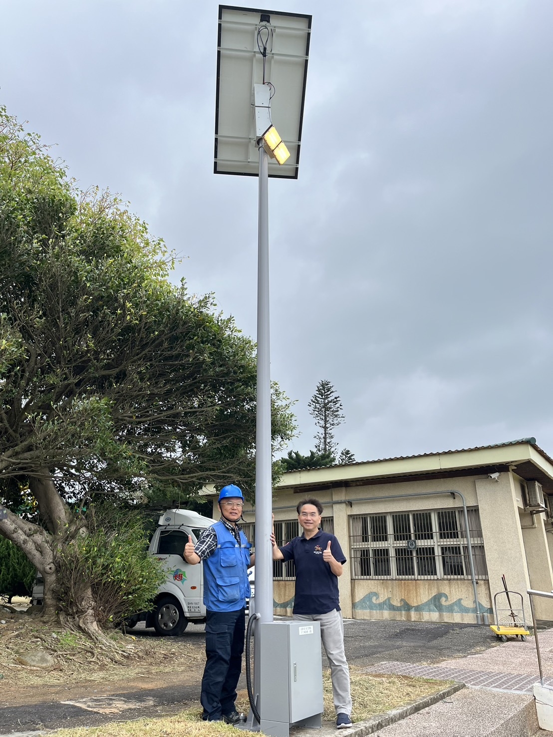 熊道邦(左)捐贈太陽能LED路燈給觀音國中。 圖∕黃博欽