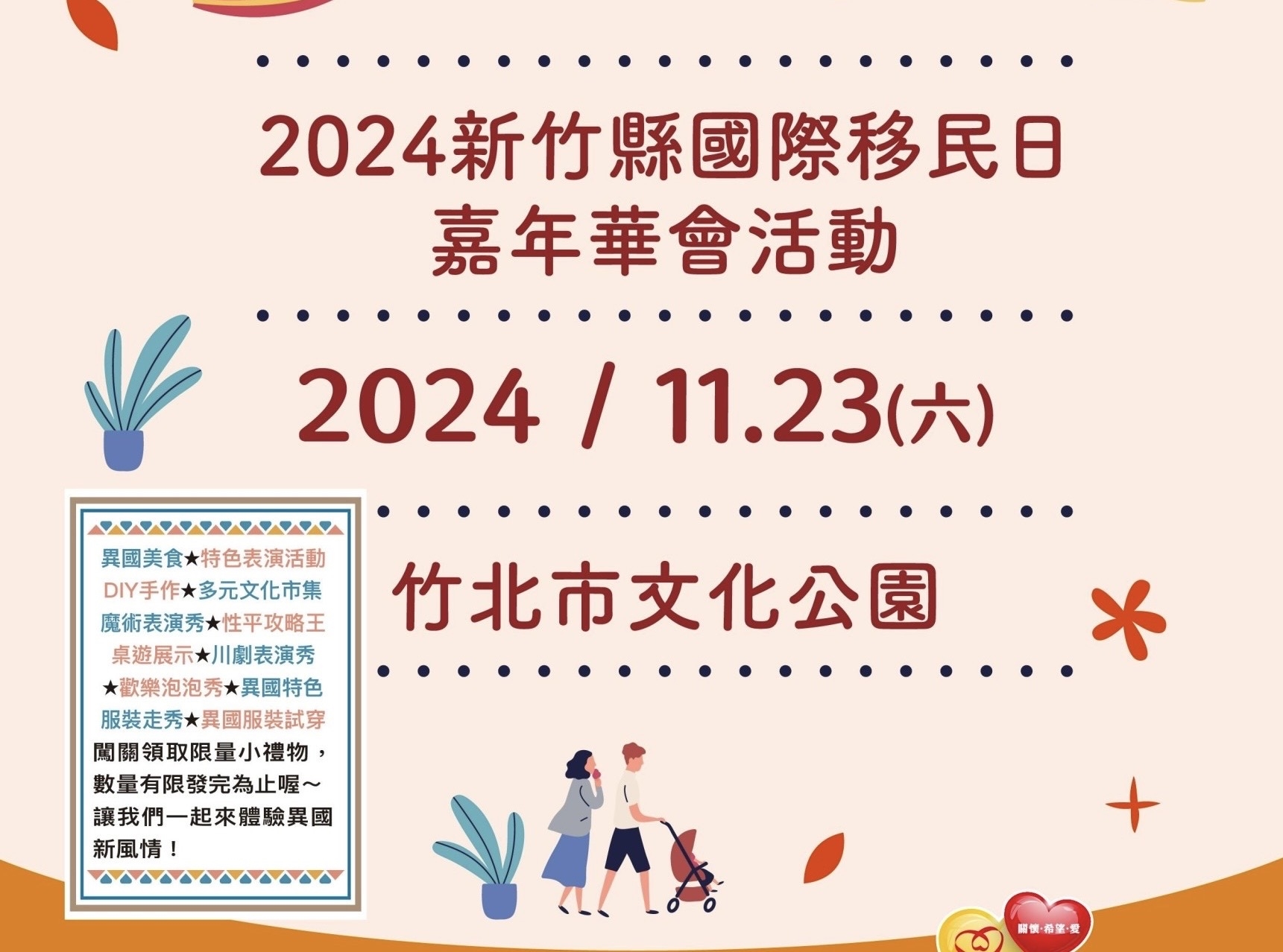 為慶祝國際移民日,2024竹縣國際移民日嘉年華會將於23日(週六)上午9時30分至下午1時30分,在竹北市文化公園盛大舉行!將以“移”起Say Hello為主題,象徵新竹縣感謝新住民的加入及歡迎新住民的多元文化,新住民文化在新竹多年,舉辦新住民嘉年華為竹縣最大盛事,展現共融精神,為大小朋友帶來豐富娛樂活動與多樣的文化體驗。