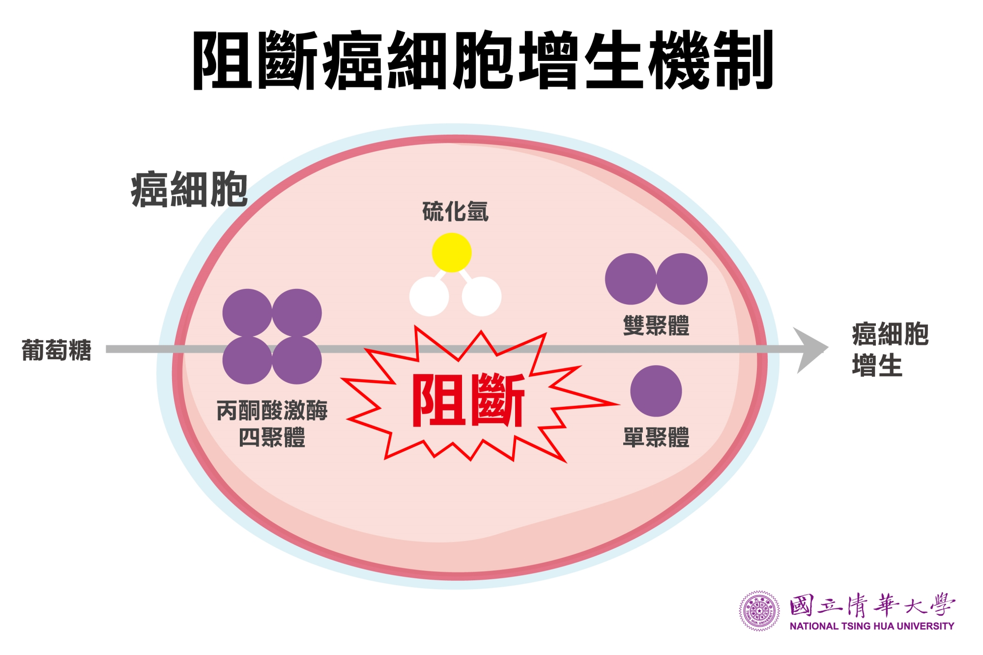 林愷悌指出,在缺氧的腫瘤環境中,癌細胞會分泌出硫化氫,對四聚體蛋白質丙酮酸激酶(PKM2)發出訊號,讓它分解成分子較小的雙聚體或單聚體,改變其活性,促使癌細胞攝取更多的葡萄糖來進行糖解作用、合成DNA,並迅速增生。