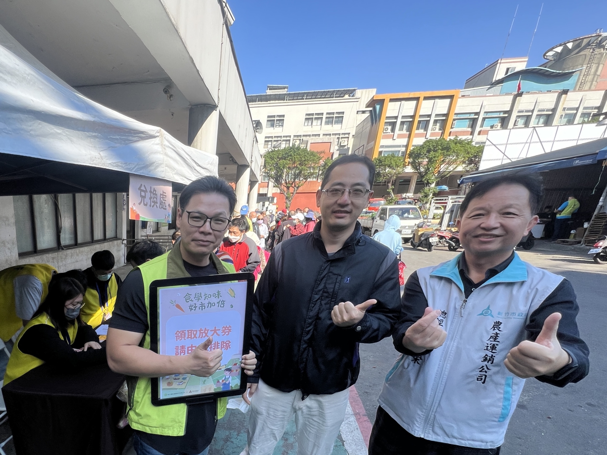 新竹果菜市場六日上午九時,創新發放推廣食農教育二倍優惠券,市場一片大排長龍人潮,殷切用50硬幣換100元購物券,場面熱鬧滾滾。