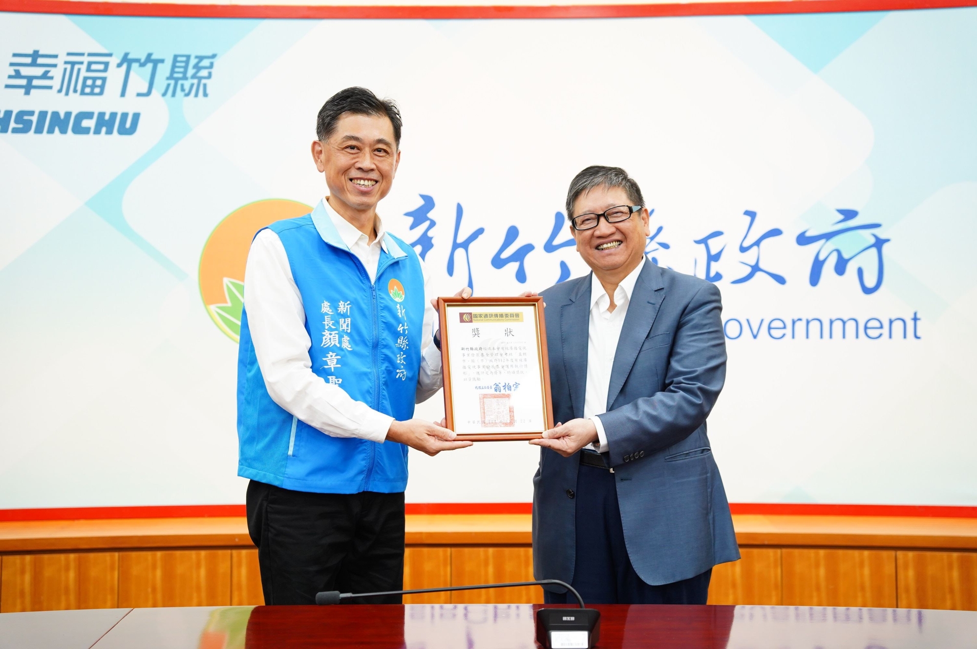 顏章聖(左)獻獎將榮耀分享楊文科(右)及縣民。. 圖∕竹縣府