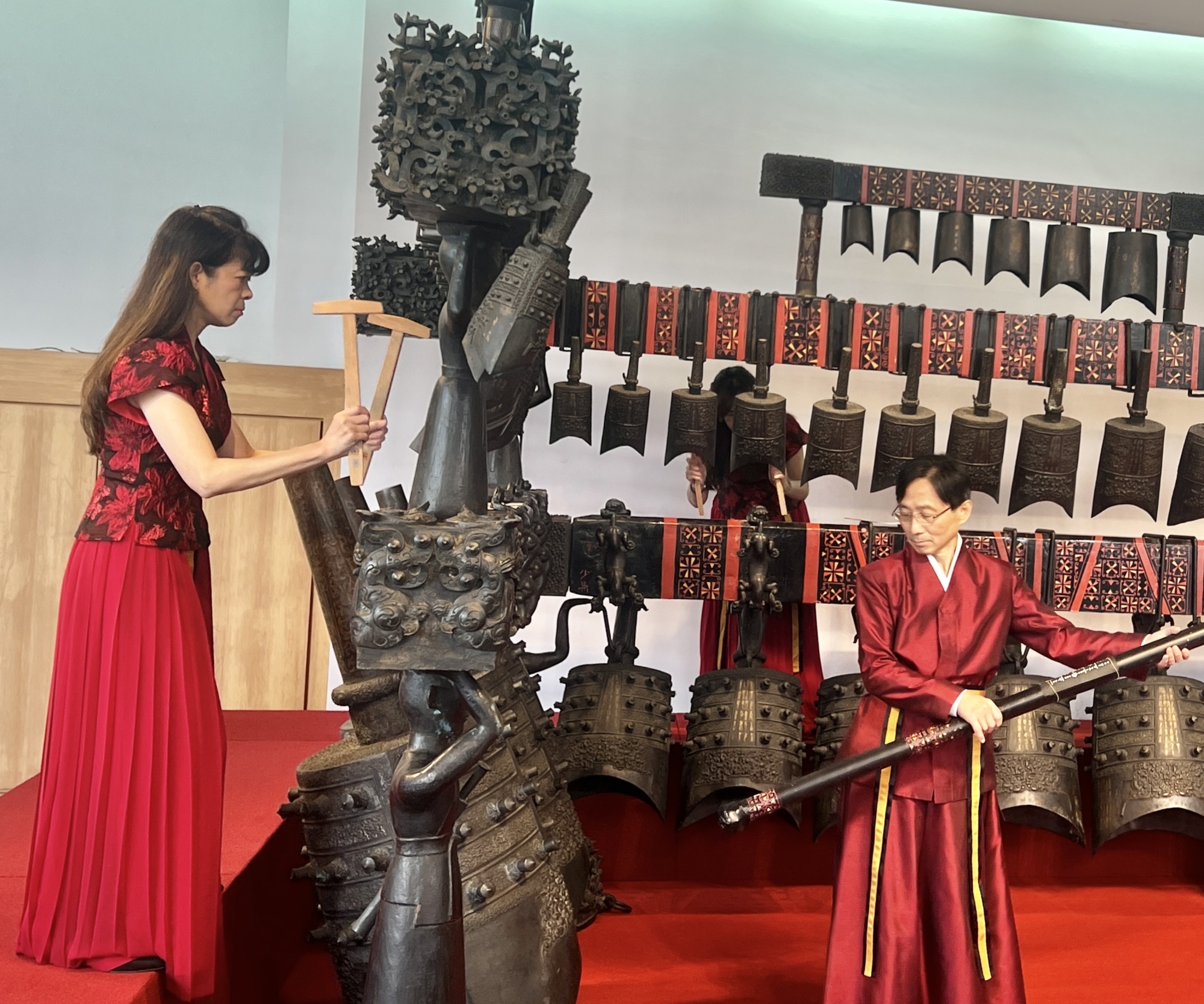 「王者再現─曾侯乙編鐘複製件合作展演」開幕記者會今(27)日於新竹市文化局演藝廳舉行,邀請臺灣國樂團帶來精湛演出,為為期4年的編鐘複製件展覽揭開序幕。