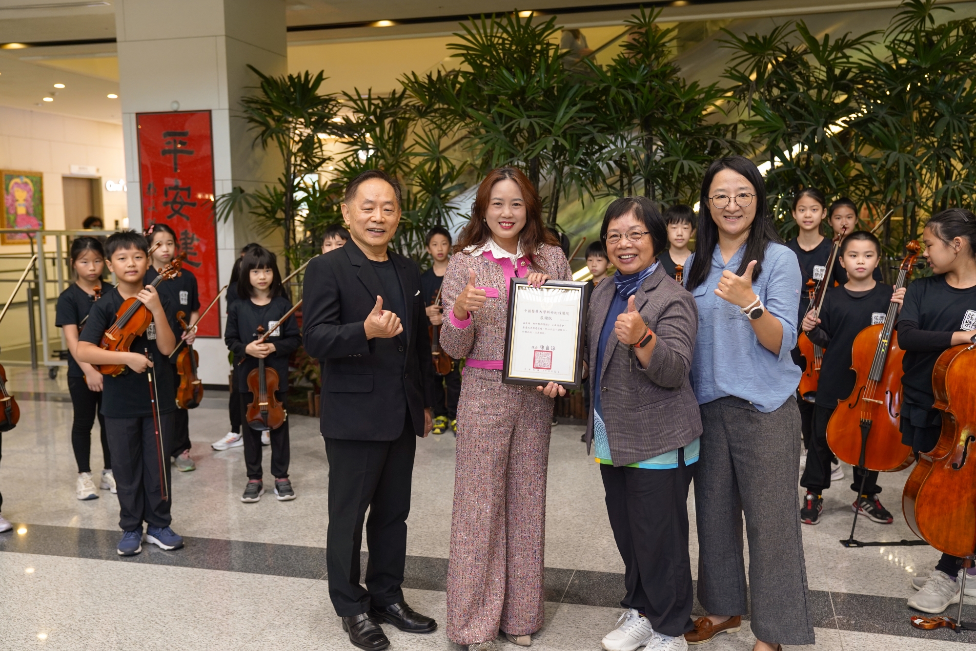 興隆國小校長葉瑞珠以及家長會長黃維楨代表全校師生感謝院方給予學生表演舞台,中醫大新竹附醫執行長張宜真頒發感謝狀,感謝興隆國小師生透過音樂撫慰家屬和病患心靈。