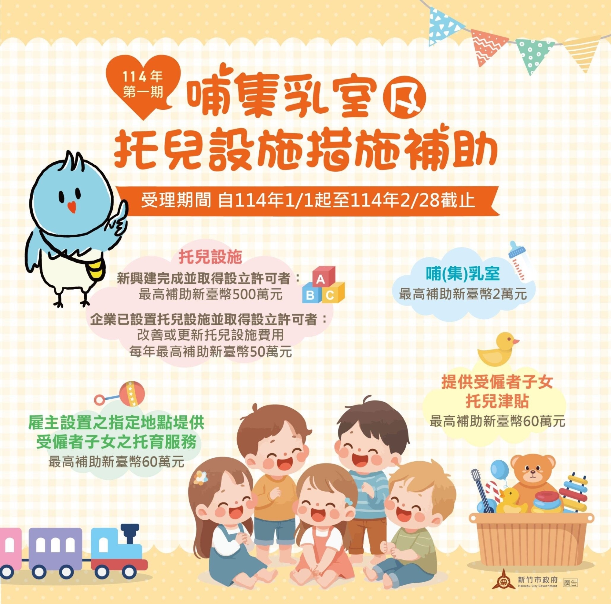 營造友善職場,協助勞工解決兒問題,新竹市政府長期推廣企業設置哺(集)乳室與托兒措施,並配合勞動部補助辦法,每年分2期受理申請,今年度第1期經費申請已於元旦開始至2月28日,托兒設施新興建完成者從過去300萬提升至最高補助500萬元。