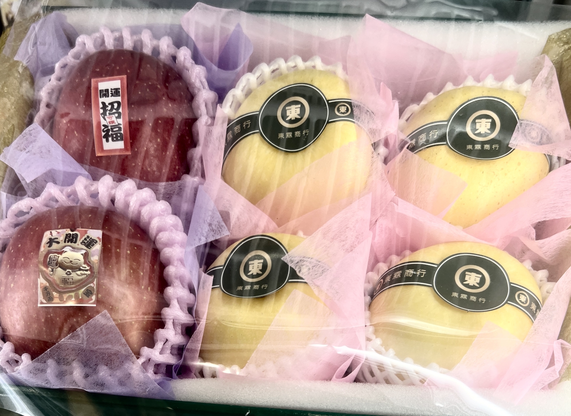 蘋果來自日本的品種琳琅滿目,價錢有高有低,目前身價較高,絕對青脆可口,開運招福紅白雙色包裝蘋果,一盒六個1800元,平均一個三百元,哈蜜瓜果凍八個,加上三個精緻湯匙1300,一個果凍超過一百元。