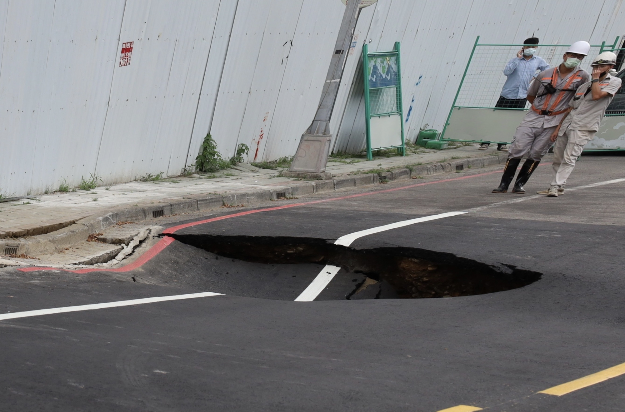 竹縣工務處指出,建案因上次坍塌已全面停工中,目前在施工的是路基固化工程,以低壓灌漿方式固化,今天下午因地下水流動、自來水管漏水,造成上次坍塌處路面又坍塌。