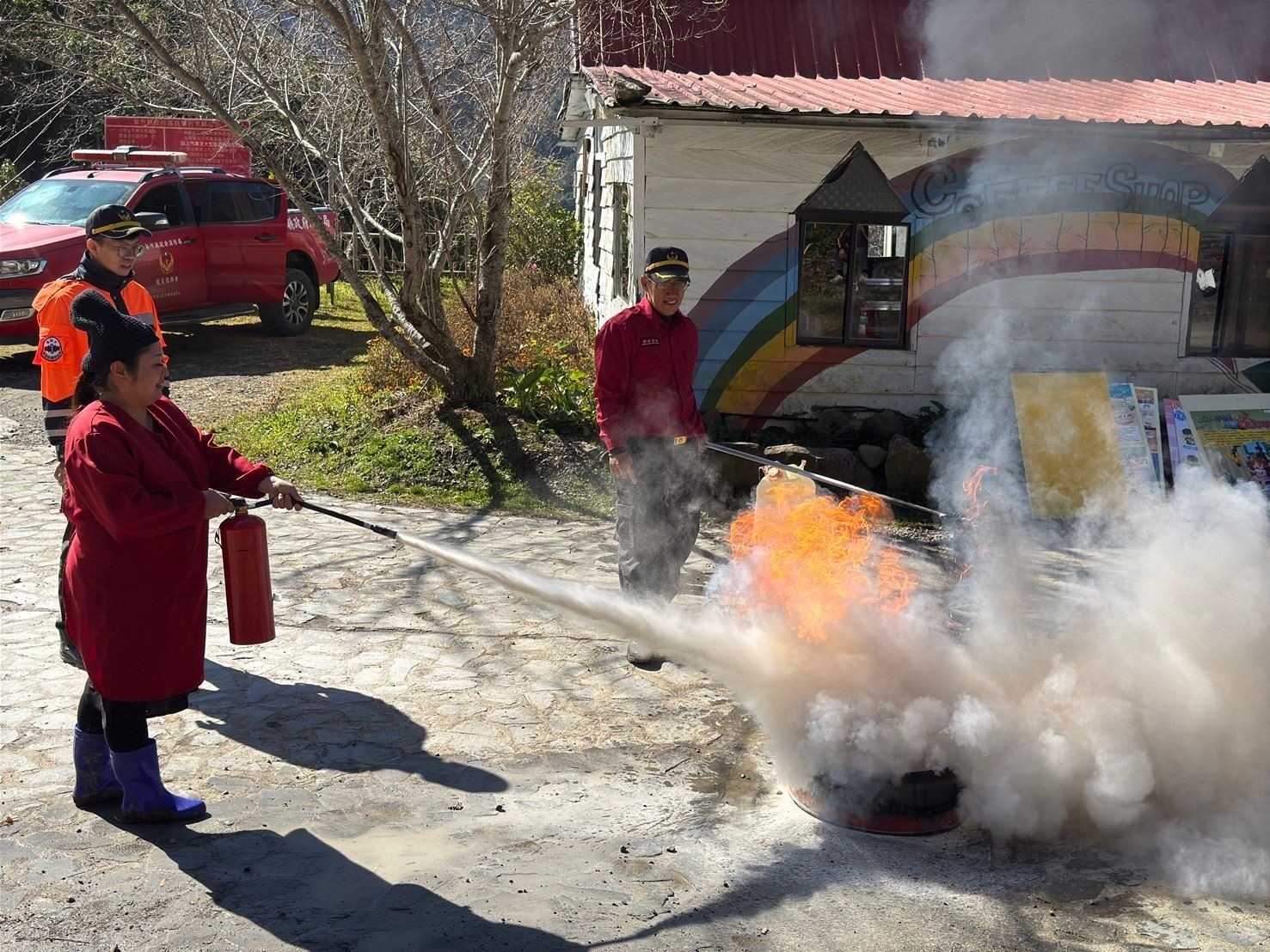 讓部落居民親自體驗(操作示範CPR、滅火器油盤滅火及消防車射水)等宣導活動;加深當地唯一司馬庫斯分班學生及部落居民熟悉消防器材的使用,建立起完善的自衛消防編組。