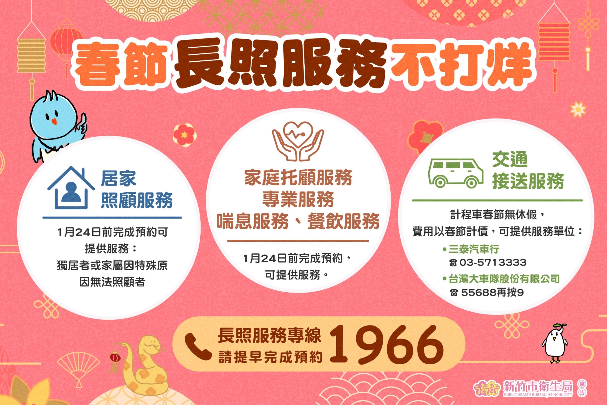 隨著農曆春節將至,街頭巷尾逐漸充滿新年氛圍。代理市長邱臣遠表示,新竹市的長照服務春節期間不打烊(1/25-2/2),如有長照服務相關需求,請於1月24日前完成預約申請,讓春節期間的長照服務和喘息服務延續,減輕家庭照顧者的壓力,平安過好年。
