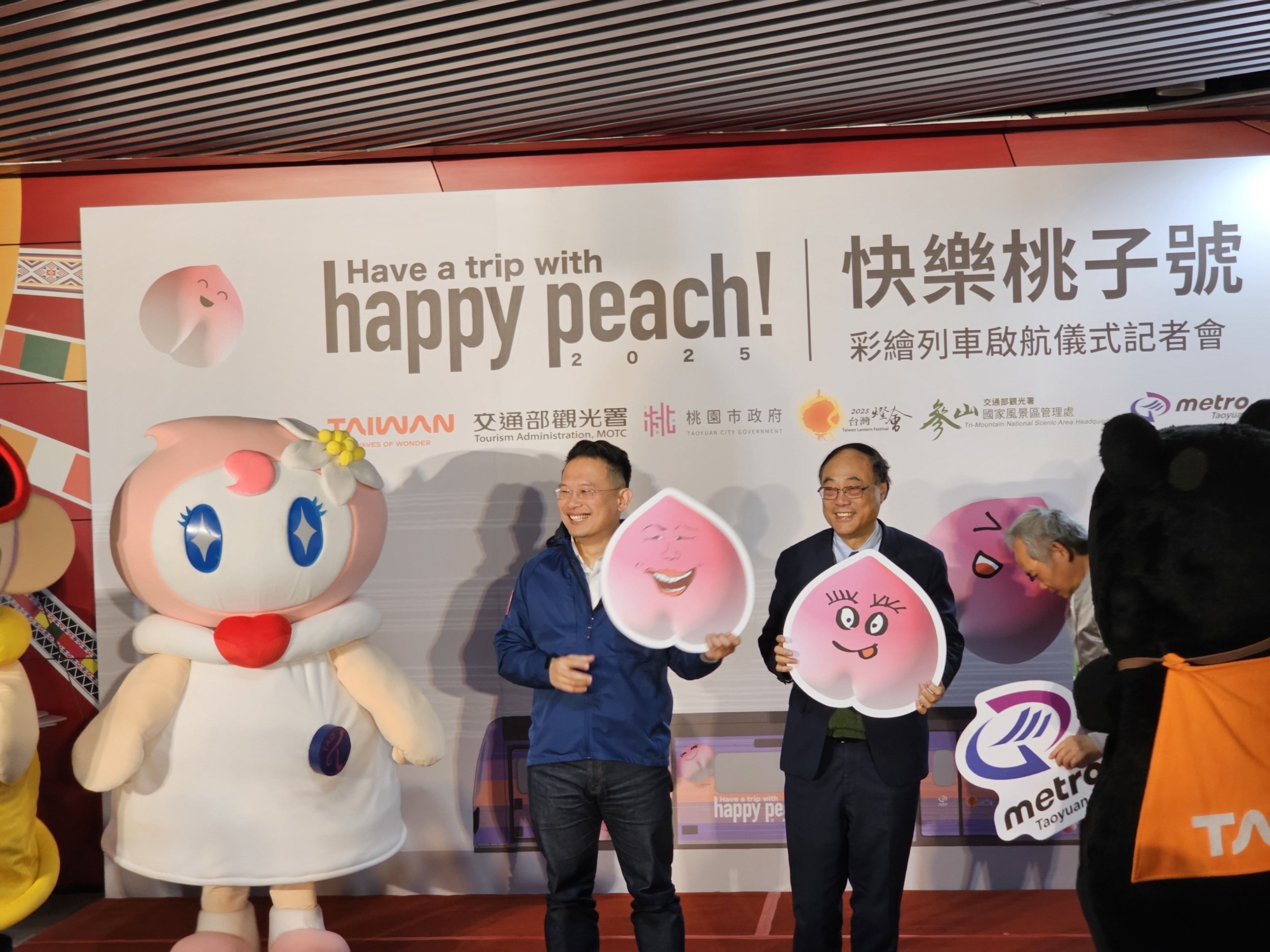 2025台灣燈會的亮點之一-彩繪捷運「快樂桃子號」,今(20)日在桃園捷運A17領航站正式啟航,由桃園市副市長蘇俊賓與交通部觀光署署長周永暉共同揭幕。