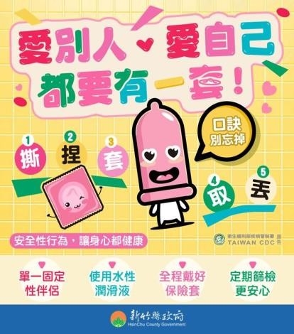 14日西洋情人節,新竹縣衛生局提醒,健康是最好的情人節禮物,歡度浪漫的同時要做好個人保護,愛別人、愛自己,請全程正確使用保險套!衛生局表示,全程正確使用保險套可有效預防與控制愛滋病、性傳染病(如梅毒、淋病)及M痘等疾病,讓愛更安心、更健康。
