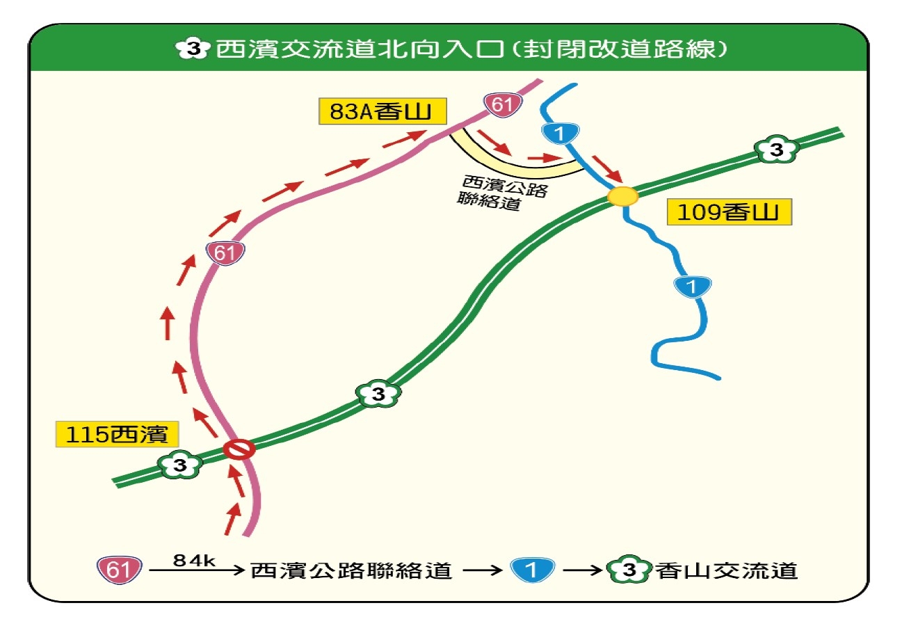 二、行駛台61線(北上)匯出香山匝道銜接西濱公路聯絡道,再匯入國道3號香山交流道北上匝道。