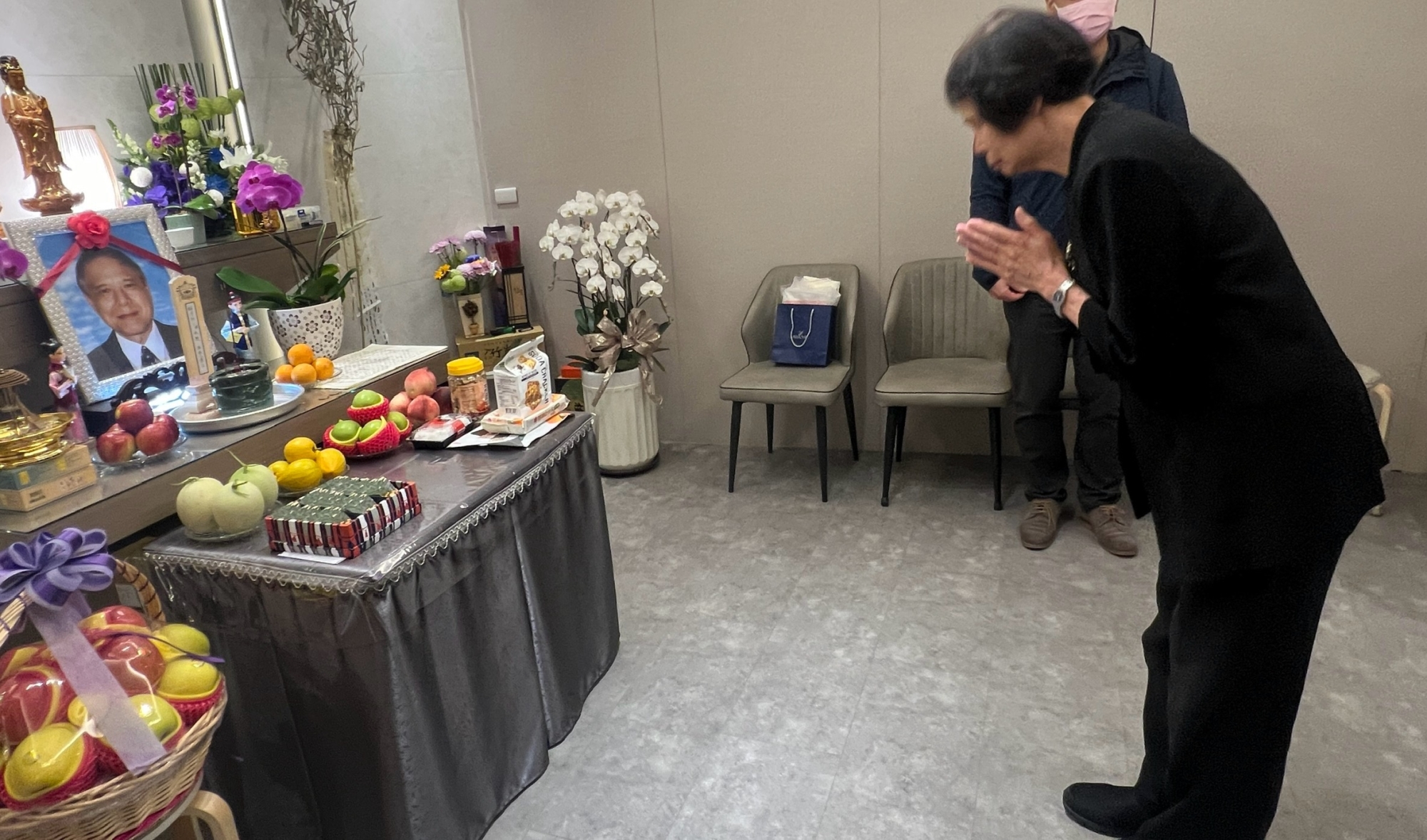 何瑞英嚴肅端莊打扮,見到老公昔日高材生出現眼前,有些意外驚訝!因為新竹市體育發展協會創會長張孟雄,連絡安排紀政到恩師靈前上香,沒有驚動柯老師家人,自行到「柯爸」靈前上香和一般人一樣,表示最大誠意和尊敬。