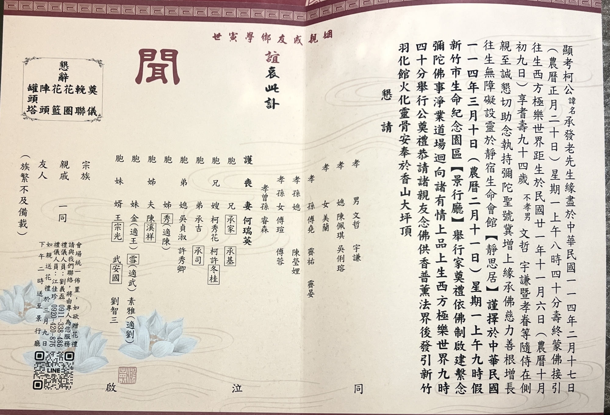 「柯爸」柯承發老師告別前夕,中華大學校長劉維琪、副校長和管理學院院長裴文及老師、校友,都先後至柯承發靈前上香悼念,此舉也肯定柯承發二公子柯宇謙,在中華大學任教認真用心,受到學生尊敬與同事們和睦精誠友愛。
