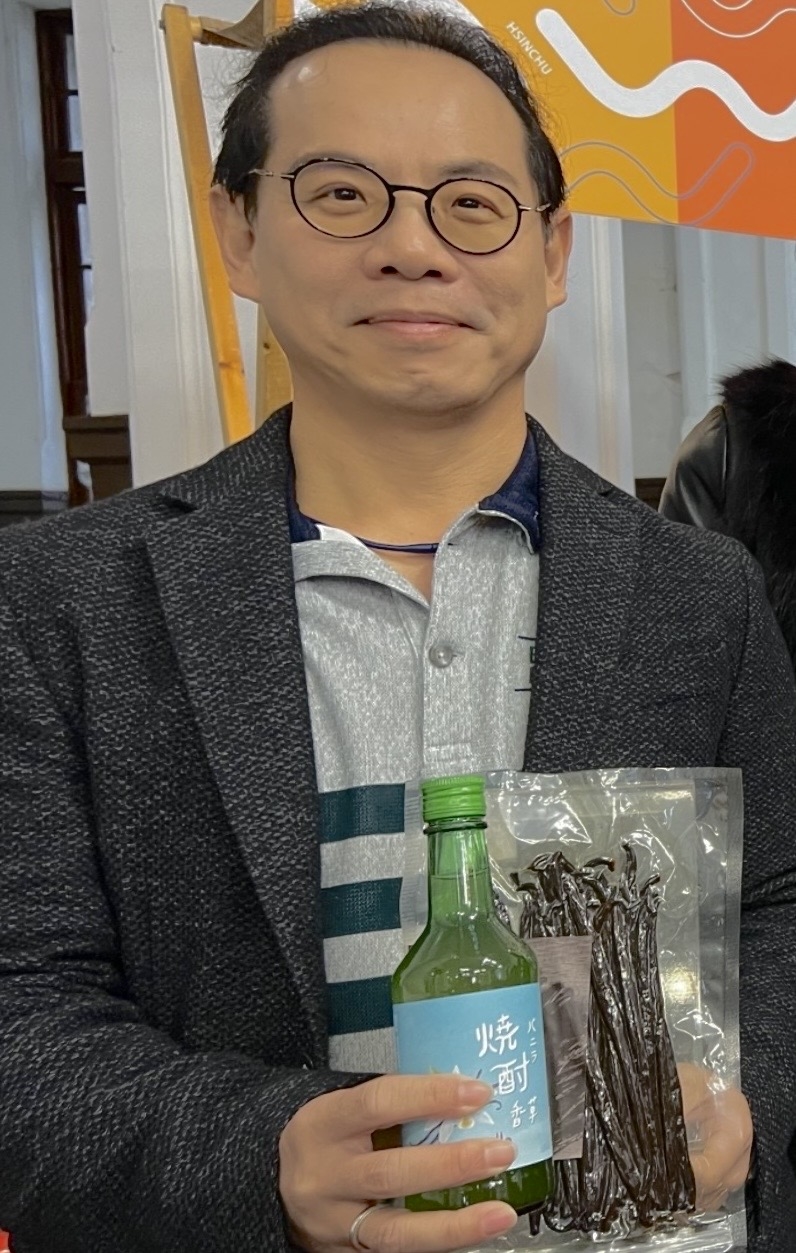新竹市品牌佳明香草園老闆林佳慶,在新竹市舉辦事前記者會,即信心十足帶著創新研發成功的燒酒,強調一定會受歡迎,強力行銷日本與當地燒酒較量,贏得喝彩。