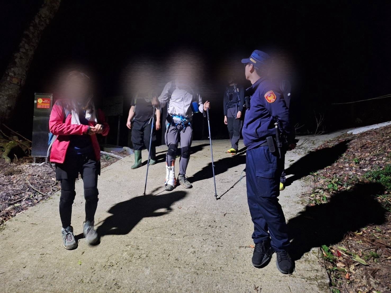 苗栗縣警察局頭份分局南庄分駐所,於28日1時50分許,接獲民眾報案稱,2名登山客於加里山步道健行登山,返程途中,因不熟路況且山路濕滑,不慎致右腳扭傷無法順利下山,請求警方協助,警員邱文均、趙乃慧立即前往查處。