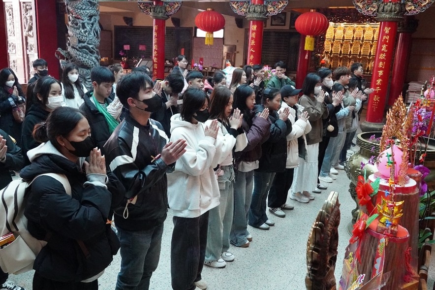 越南同學阮氏雪貞表示,很高興學校能夠安排校外活動,讓同學們能夠走到戶外,也能感受台灣獨特的廟宇文化與習俗。自去年來台灣後,就下定決心要念觀光學院學士班,以餐飲產業為目標邁進,希望未來能留在台灣就業賺錢。