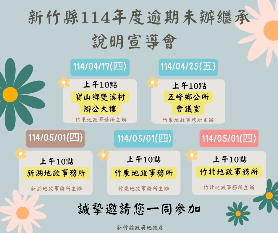 為協助繼承人了解繼承登記流程及後續處理事項,縣府與各地政事務所將於4月和5月舉辦5場次的繼承登記宣導說明會,幫助民眾在收到通知後能更清楚該如何處理。