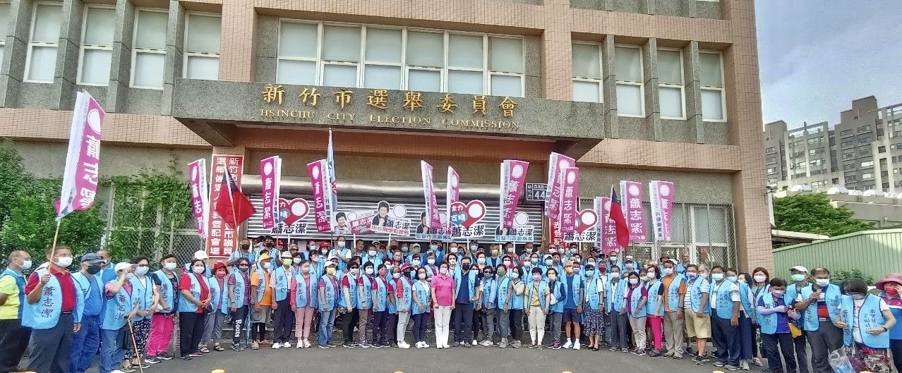 蕭志潔請友人指點、問神,選定今天黃道吉日,在第一個上班時段,拔得頭籌登記,取得勝利好兆頭,參選第11屆新竹市議員,蕭志潔感謝鄉親好友自發齊聚,陪同登記參選,如同一股最強而有力的後盾。