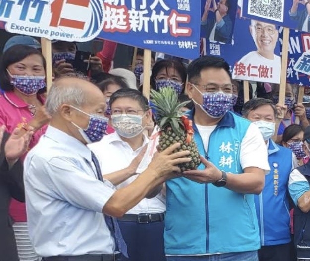 前新竹市行政院政務委員林政則贈送林耕仁鳳梨,祝福萬事興旺選票得第一 何高祿攝