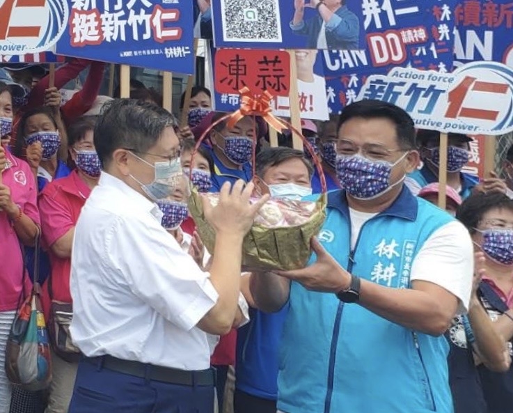 新竹縣長楊文科贈送林耕仁一籃果凍和蒜頭,祝福凍蒜高票當選 何高祿攝