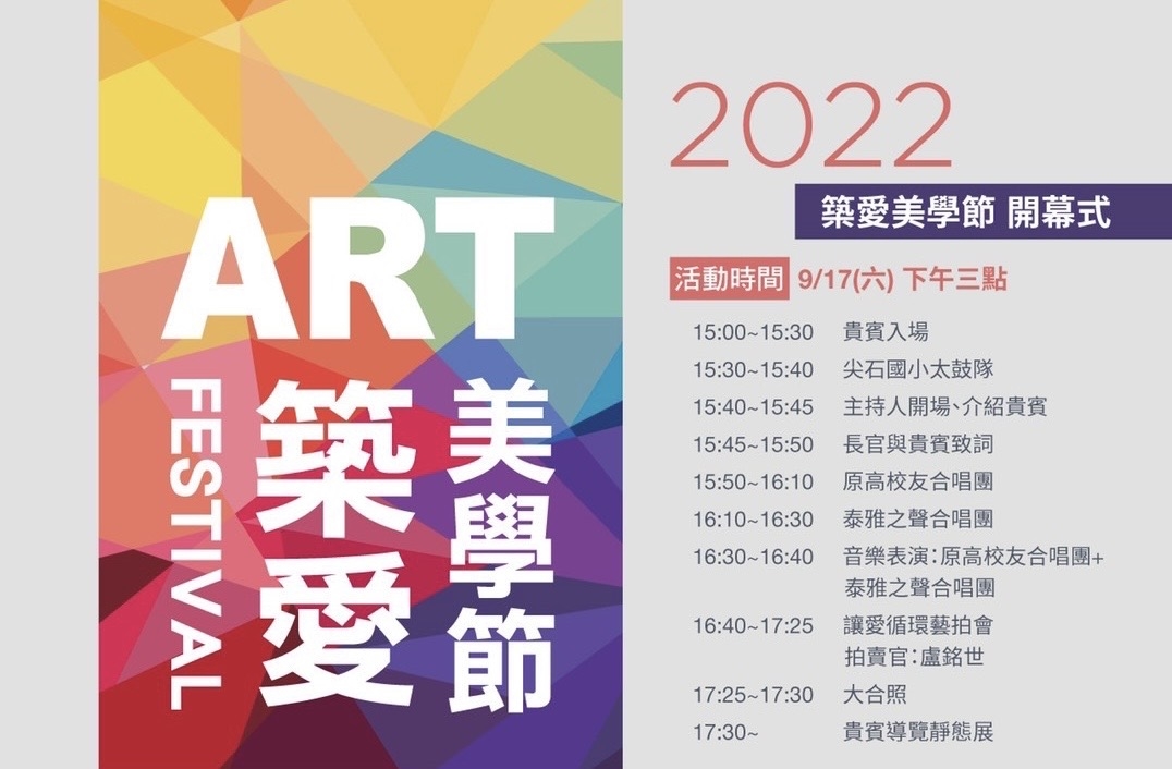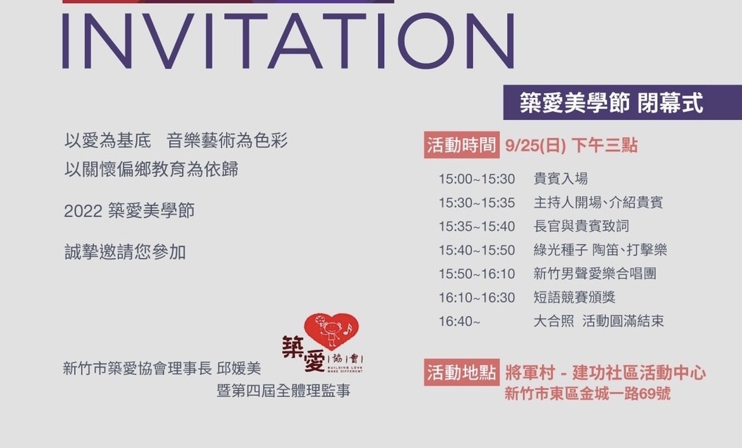 由新竹市築愛協會主辦、新竹數家科技公司及在地業者共襄舉辦 的「第一屆 2022 築愛美學節」,將於 9 月 13 至 25 日在新竹市將軍村 舉辦。活動內容包括美術作品展、藝拍會、黑膠之夜、音樂、電影、 綠色市集、短語競賽等七大主題活動,在涼爽的初秋九月,為新竹市 民提供世界水準的城市藝文饗宴! 亦思科技共同創辦人邱媛美,是本次活動發起人,同時也擔任新 竹市築愛協會理事長。2022 年,她邀請包含台灣光罩、亦思科技、 帆宣科技、欣銓科技、科準科技、春福建設·煙波大飯店、盟立自動 化、愛上喜翁、聯毅科技等,共同推出第一屆「築愛美學節」,大家 一起讓新竹成為科技 x 藝術的城市。 長期從事公益服務的邱媛美,曾經擔任過全台第一所原住民高中 -原聲國際學校校長,她表示:「企業的成功是取之於社會,成功代表 對社會有更多的義務。在職場時,我曾經獲得非常多的幫助,因此在 退休後,我希望可以投入累積的人脈與經驗,讓台灣充滿愛與幸福。」 邱媛美接任新竹市築愛協會理事長一職後,即投入幫助經濟弱勢青少 年及孩童發展人文藝術及美學教育,以「愛」為底蘊、以「養」為軸 線,用實際行動關懷 18 歲以下青年的美學教育。2022 年她力邀數家 科技公司及在地企業,共同舉辦築愛美學節活動,藉由活動推廣生活 美學,讓藝文欣賞成為新竹市民的日常。 第一屆築愛美學節的開幕式,定於 9/17(六)下午三點半,現場 將邀請尖石國小太鼓隊、泰雅之聲合唱團、原高校友合唱團於現場演 出,同時也將舉辦讓愛循環藝拍會活動,拍賣所得將全數捐給台灣原 聲教育協會,作為偏鄉教育基金。晚上七點放映電影「聽見歌再唱」, 映後將邀請導演-楊智麟到場舉行映後座談。此外,下午三點至晚上 九點,周邊還有綠色市集,活動非常精彩豐富。
